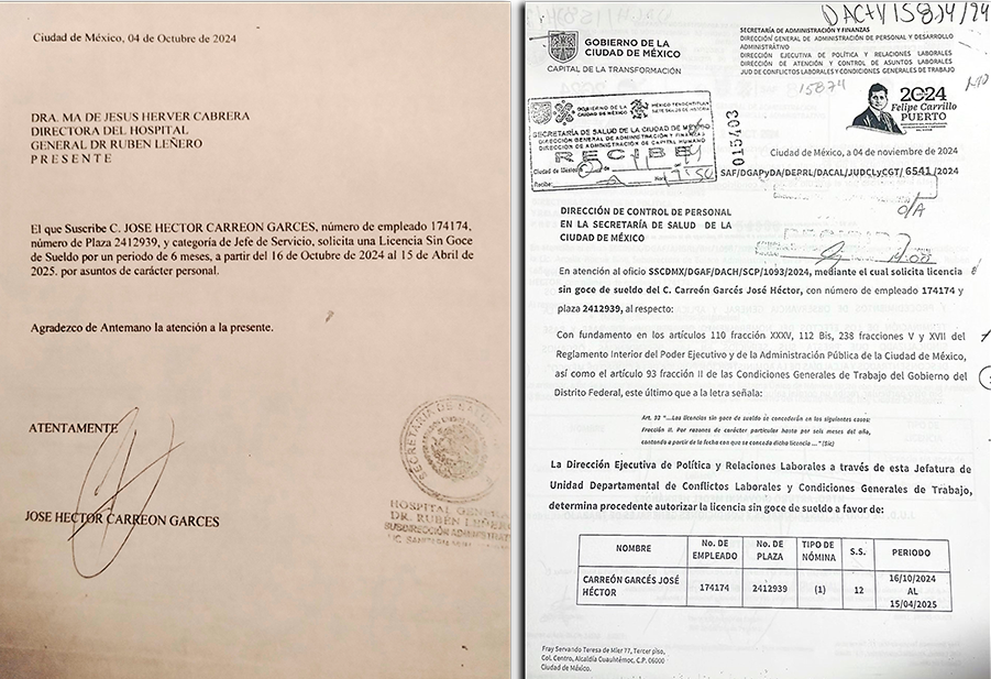 A nuestras manos llegaron documentos que confirman otra de las tantas mentiras del “hamponazo” de SIMESA; con fecha 4 de octubre, Carreón solicitó una licencia sin goce de sueldo por un periodo de 6 meses –que concluirá el próximo 15 de abril–, a la Directora del Hospital Rubén Leñero, la Dra. Ma. de Jesús Herver Cabrera, como también a la Dirección de Control de Personal de la Secretaría de Salud de la CDMX.