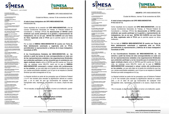 Dinamita pura a las estratagemas inventadas por Cotero y sus escasos seguidores, en el sentido de que solo ellos tenían la representación legal para negociar con el IMSS-Bienestar. En noviembre pasado el líder de SIMESA se atrevió a amenazar en sus comunicados de chisguete que procedería jurídicamente contra el Sindicato de Salud, por carecer de reconocimiento y toma de nota, cuando es una de las organizaciones gremiales con 80 años de antigüedad y el tercer sindicato más numeroso del país, solo abajo del SNTE y el Sindicato del Seguro Sociales (SNTSS).