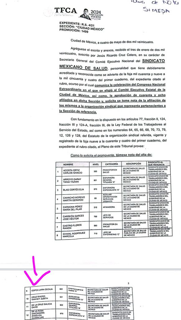 Tras analizar la escena, no puede menos que conjeturarse que Héctor Carreón Garcés ha terminado por contagiar de su mitomanía a sus incondicionales, porque la enfermera Copca NO ES AGREMIADA a la Sección 12 como lo demuestra la toma denota del Comité en la CDMX, del Sindicato Mexicano de Salud (SIMESA), donde aparece como parte de su composición.
