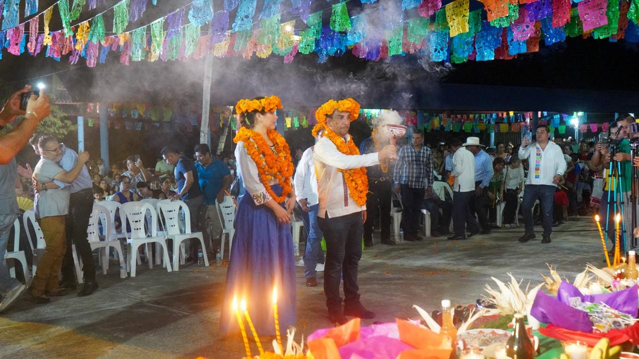 El presidente municipal, José Alfredo San Román Duval, y su distinguida esposa, Kristel Rodríguez Flores, presidenta del Sistema DIF Huejutla, encabezaron esta celebración, en la que fueron objeto de múltiples muestras de afecto, siendo recibidos por la población con coronas y collares de cempoalxóchitl, símbolos del respeto y agradecimiento de la comunidad hacia sus autoridades.