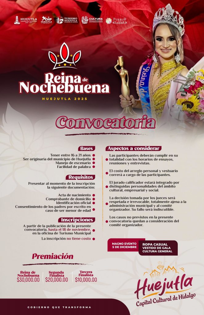 El Gobierno Municipal de Huejutla, encabezado por José Alfredo San Román Duval, a través de la Dirección de Turismo y en coordinación con el área de Cultura y el DIF Municipal, emitió la convocatoria dirigida a las jóvenes huejutlenses de entre 16 y 21 años de edad para participar en el Certamen Reina de Nochebuena 2025, que se celebrará el próximo 5 de diciembre.
