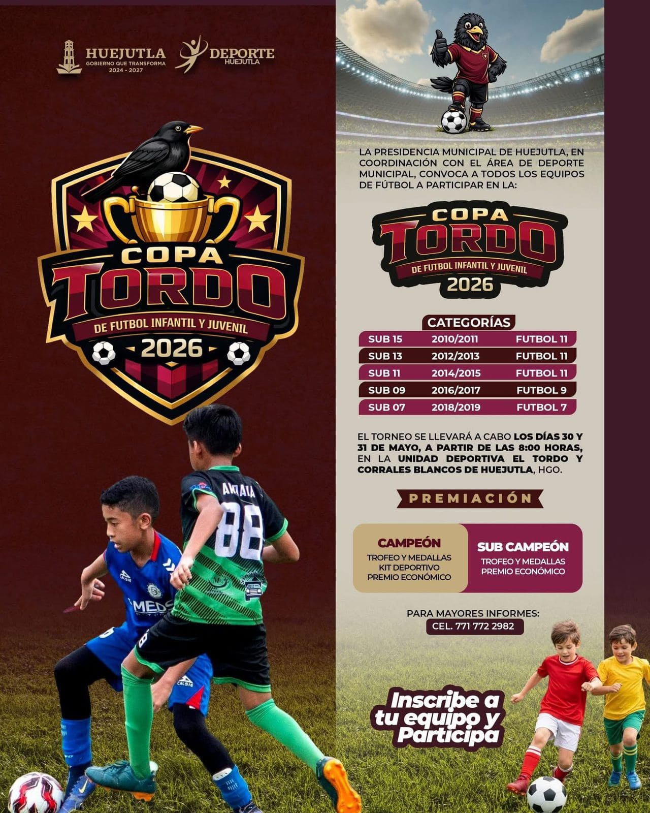 Con el objetivo de fomentar el deporte, la sana convivencia y el desarrollo integral de la niñez y juventud, el Gobierno Municipal de Huejutla, encabezado por José Alfredo San Román Duval, a través del área de Deporte Municipal, convoca a participar en la “Copa Tordo 2026” de futbol infantil y juvenil, fortaleciendo espacios que impulsan el talento local y promueven estilos de vida saludables.