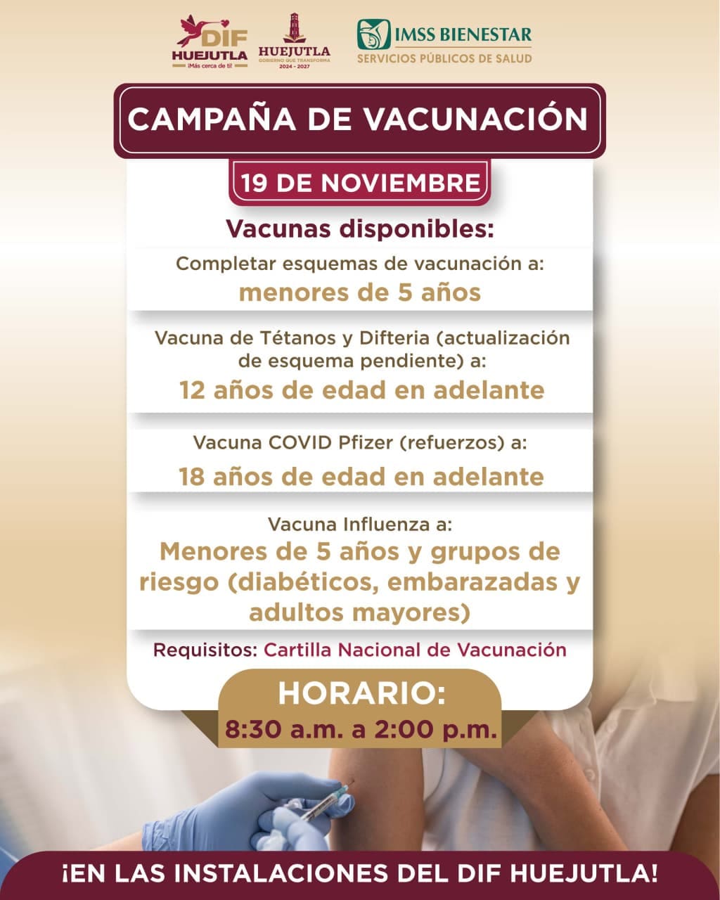 Al cuidado de la salud familiar, el Gobierno Municipal y el Sistema DIF Huejutla, en coordinación con IMSS Bienestar, invitan a la población a participar en la Campaña de Vacunación que se llevará a cabo el próximo 19 de noviembre en sus instalaciones, de 8:30 a.m. a 2:00 p.m.