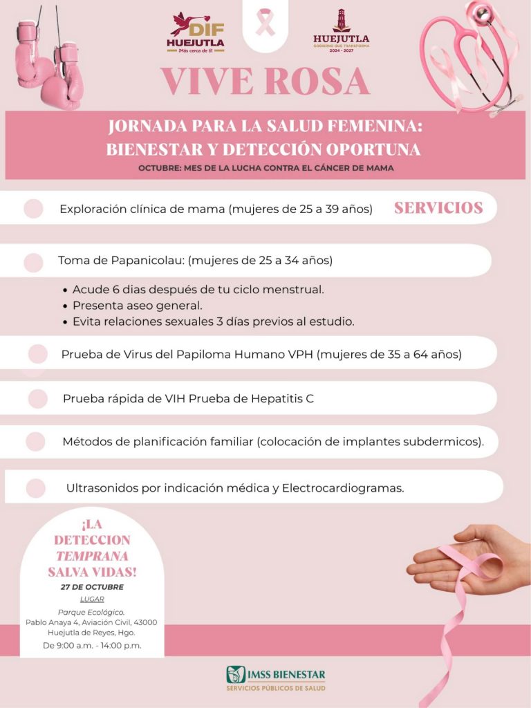 Esta importante actividad se realizará el 27 de octubre, en un horario de 9:00 de la mañana a 2:00 de la tarde, en las instalaciones del Parque Ecológico, donde se espera la participación de mujeres de Huejutla y de la región Huasteca. Durante la jornada se contará con la colaboración de personal médico y de enfermería del Hospital Regional de la Huasteca, el Hospital Integral de Atlapexco y el Hospital Ilusión de Tlanchinol.