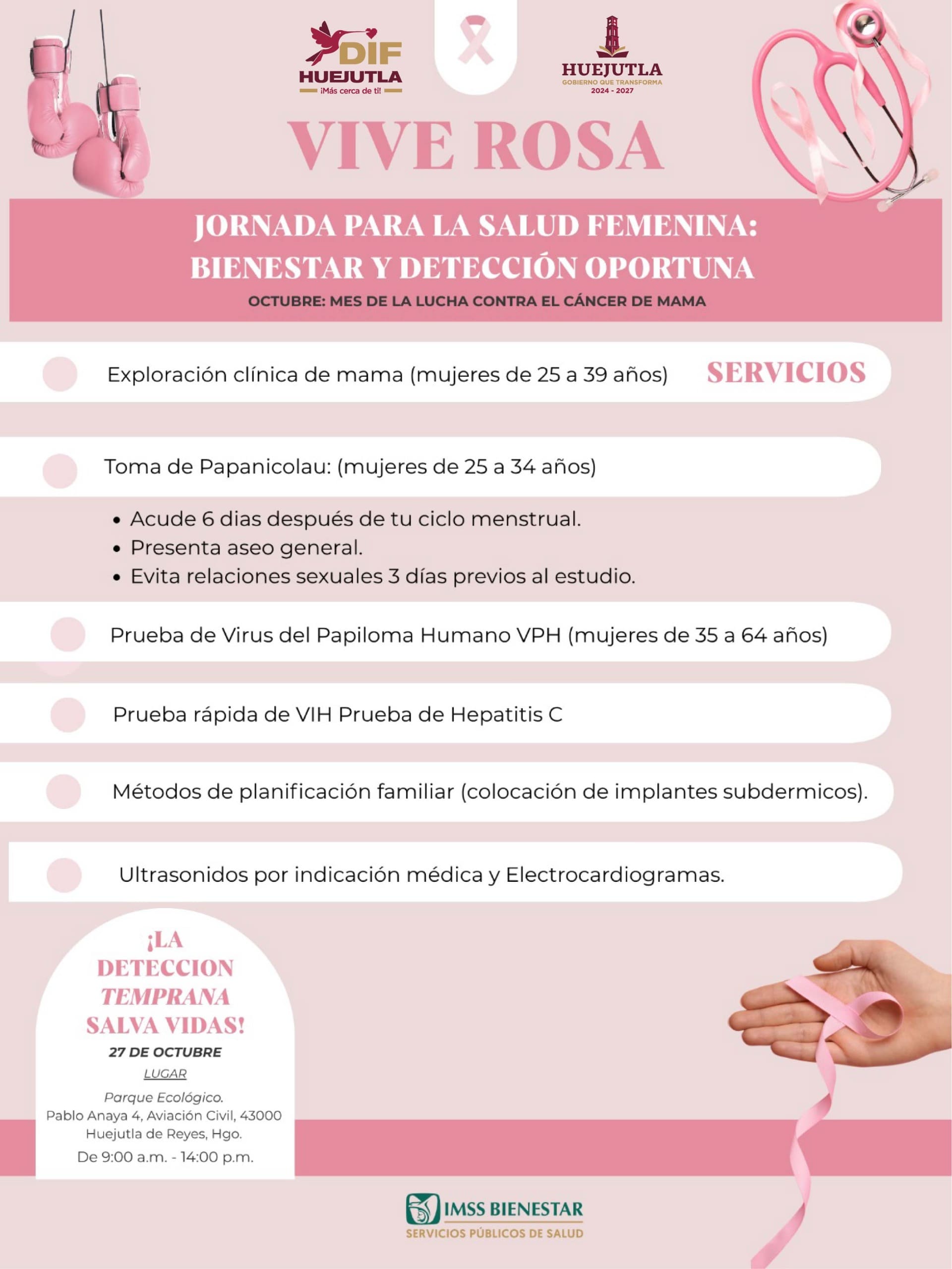 Esta importante actividad se realizará el 27 de octubre, en un horario de 9:00 de la mañana a 2:00 de la tarde, en las instalaciones del Parque Ecológico, donde se espera la participación de mujeres de Huejutla y de la región Huasteca. Durante la jornada se contará con la colaboración de personal médico y de enfermería del Hospital Regional de la Huasteca, el Hospital Integral de Atlapexco y el Hospital Ilusión de Tlanchinol.