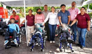 ● El presidente Municipal, José Alfredo San Román Duval y Kristel Rodríguez, presidenta del Sistema DIF Municipal, encabezaron la entrega gratuita de andaderas, sillas de rueda, sillas PCI, sillas PCA, muletas y otros beneficios a niños, jóvenes y adultos en vulnerabilidad