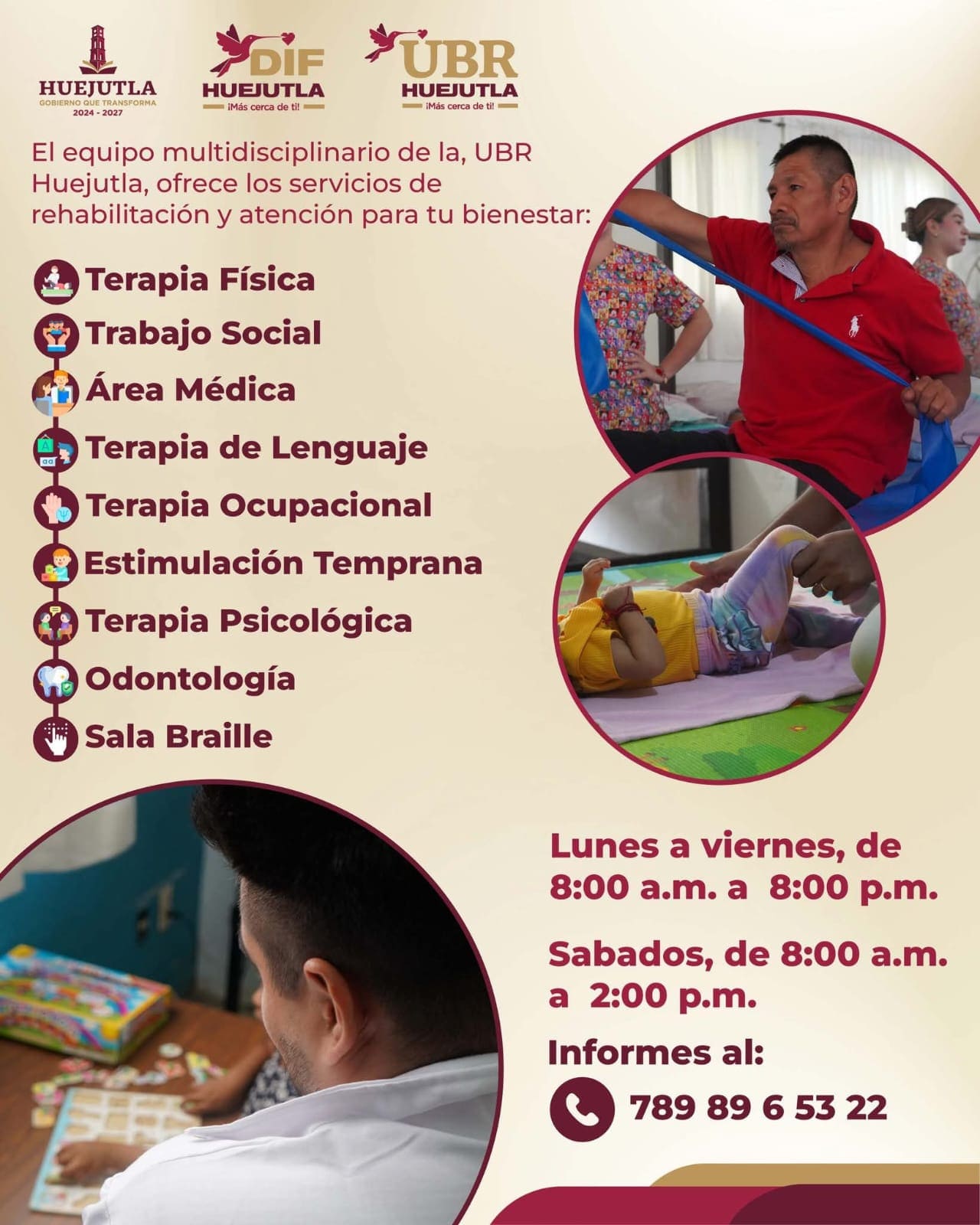 El Sistema DIF Huejutla, que preside Kristel Rodríguez Flores, informa a la población que la Unidad Básica de Rehabilitación, (UBR), ha actualizado sus horarios de atención con el fin de ofrecer un servicio más accesible, oportuno y cercano a las necesidades de las familias huejutlenses.