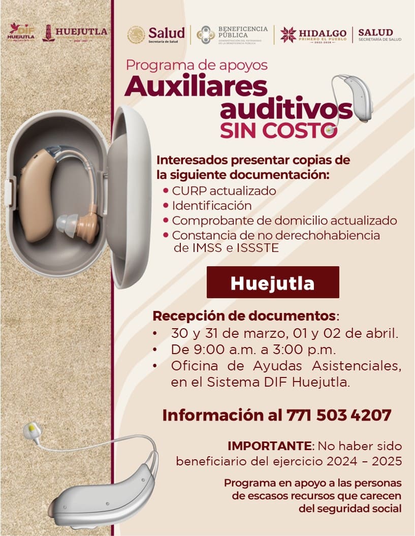 Resultado del esfuerzo conjunto para mejorar la calidad de vida de las personas con discapacidad auditiva y su economía, el Sistema DIF Municipal de Huejutla invita a participar en el registro del Programa de Apoyo de Auxiliares Auditivos Sin Costo, implementado por la Secretaría de Salud y la Beneficencia Pública, en coordinación con el Gobierno de Hidalgo y el Gobierno Municipal de Huejutla de Reyes.