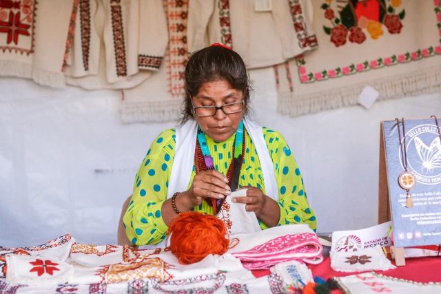 También se aprecian quexquémetl, gabanes y rebozos de San José del Rincón con la maestría de Beatriz Mondragón Paulino, junto con figuras de vidrio estirado de Otumba, fibras vegetales de Atenco y reproducciones prehispánicas de Texcoco.