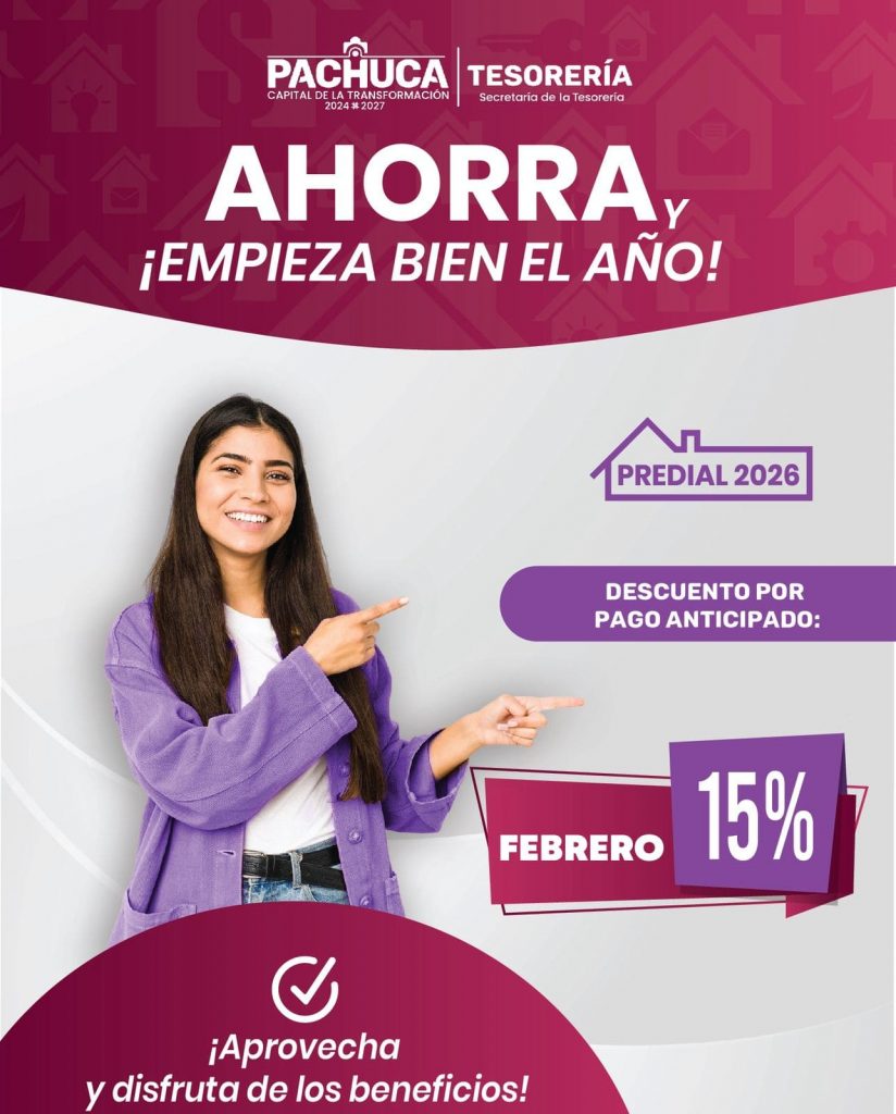 Como parte de las acciones orientadas a apoyar la economía familiar y fortalecer el cumplimiento oportuno de las contribuciones municipales, el Ayuntamiento de Pachuca, a través de la Secretaría de la Tesorería, pone en marcha los beneficios y descuentos aplicables en el mes de febrero para el pago anticipado del Predial 2026.
