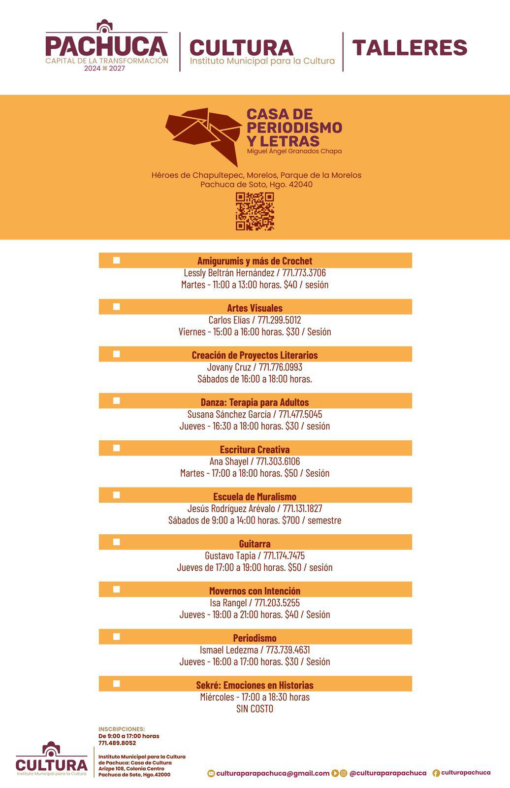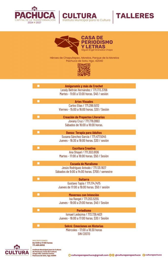 Además, invitó a la ciudadanía a conocer las sedes donde se desarrollan estos talleres, entre las que destacan: la Casa de la Cultura Municipal, PRODEC A.C., la Casa del Periodismo y Letras “Miguel Ángel Granados Chapa”, así como espacios ubicados en colonias como La Raza, Huixmi, Pitahayas, Tlapacoya y Santa Gertrudis, entre otros.