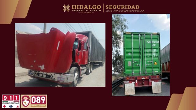 De manera paralela, durante recorridos preventivos en el Parque Industrial de Tepeji del Río, policías estatales detectaron un tractocamión que circulaba sin las debidas precauciones viales. Al realizar la inspección correspondiente, se confirmó que tanto la unidad como su caja seca contaban con reporte vigente de robo en el estado de Puebla.
