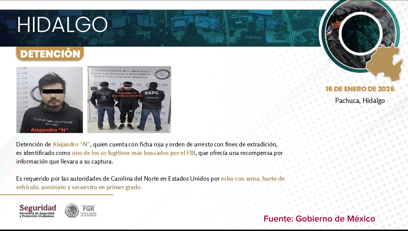 Dentro de las detenciones relevantes destacadas a nivel nacional, sobresale la captura de Alejandro “N” en Pachuca de Soto, considerado uno de los fugitivos más buscados por el FBI y requerido por autoridades de Carolina del Norte, Estados Unidos, por delitos de robo con arma, hurto de vehículo, asesinato y secuestro en primer grado, lo que reafirma la capacidad de coordinación y respuesta operativa en conjunto con instancias federales.