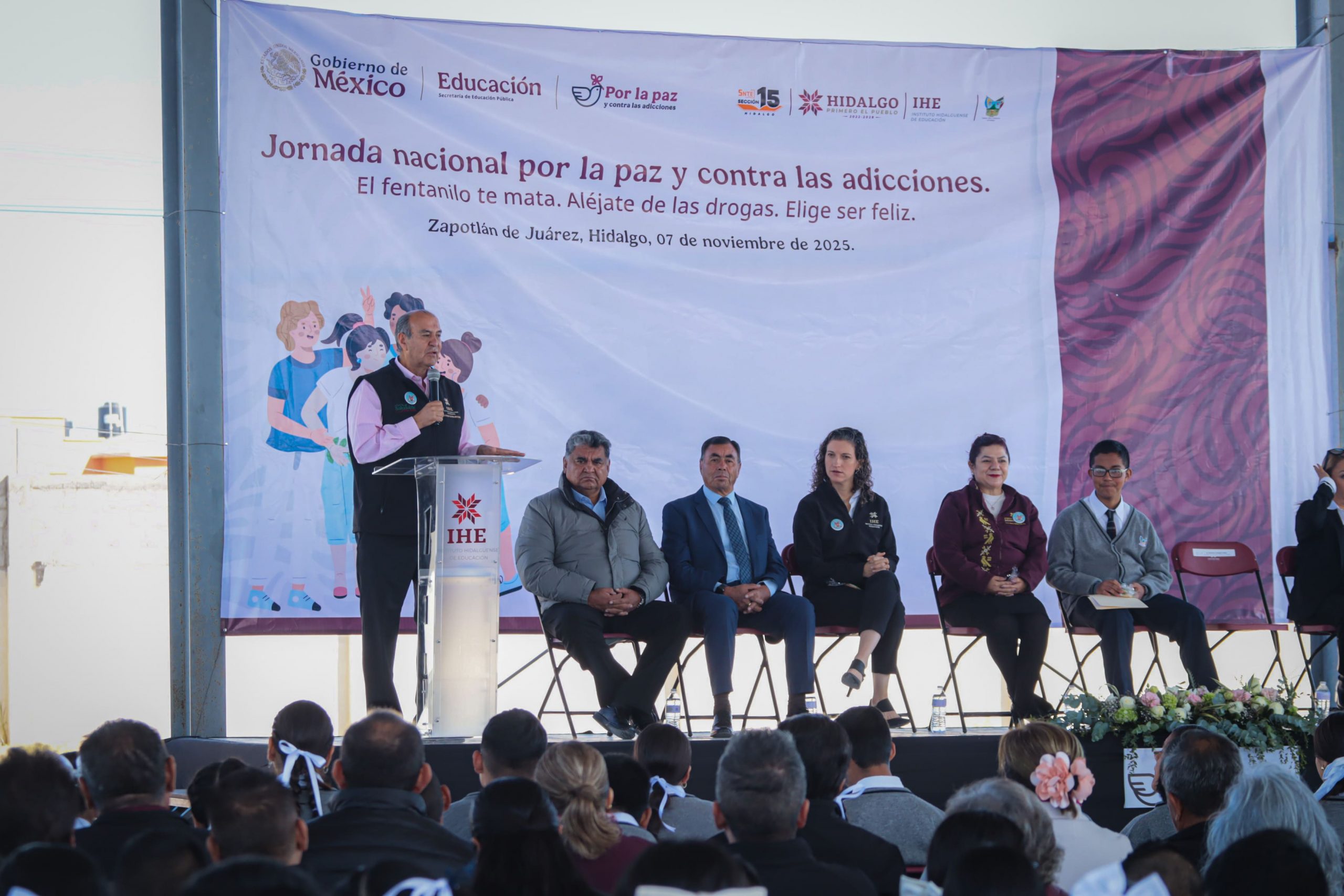 El secretario de Educación Pública de Hidalgo, Natividad Castrejón Valdez, encabezó en Zapotlán de Juárez la Jornada Nacional por la Paz y Contra las Adicciones: “El fentanilo te mata. Aléjate de las drogas. Elige ser feliz”, cuyas actividades se realizaron en la Escuela Secundaria General “Juan Guillermo Villasana López”.