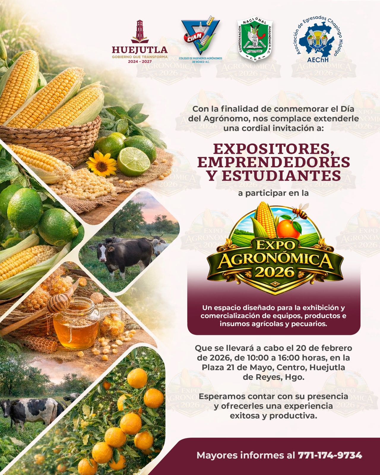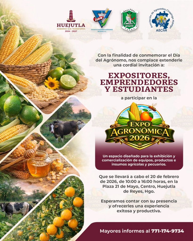 El evento se llevará a cabo el próximo 20 de febrero de 2026, en un horario de 10:00 a 16:00 horas, en la Plaza 21 de Mayo, en la zona centro de la ciudad de Huejutla de Reyes. La Expo es organizada en coordinación con el Colegio de Ingenieros Agrónomos de México A.C., la Confederación Nacional Agronómica y la Asociación de Egresados Chapingo Hidalgo, sumando esfuerzos institucionales para ofrecer un espacio destinado a la exhibición y comercialización de equipos, productos e insumos agrícolas y pecuarios.