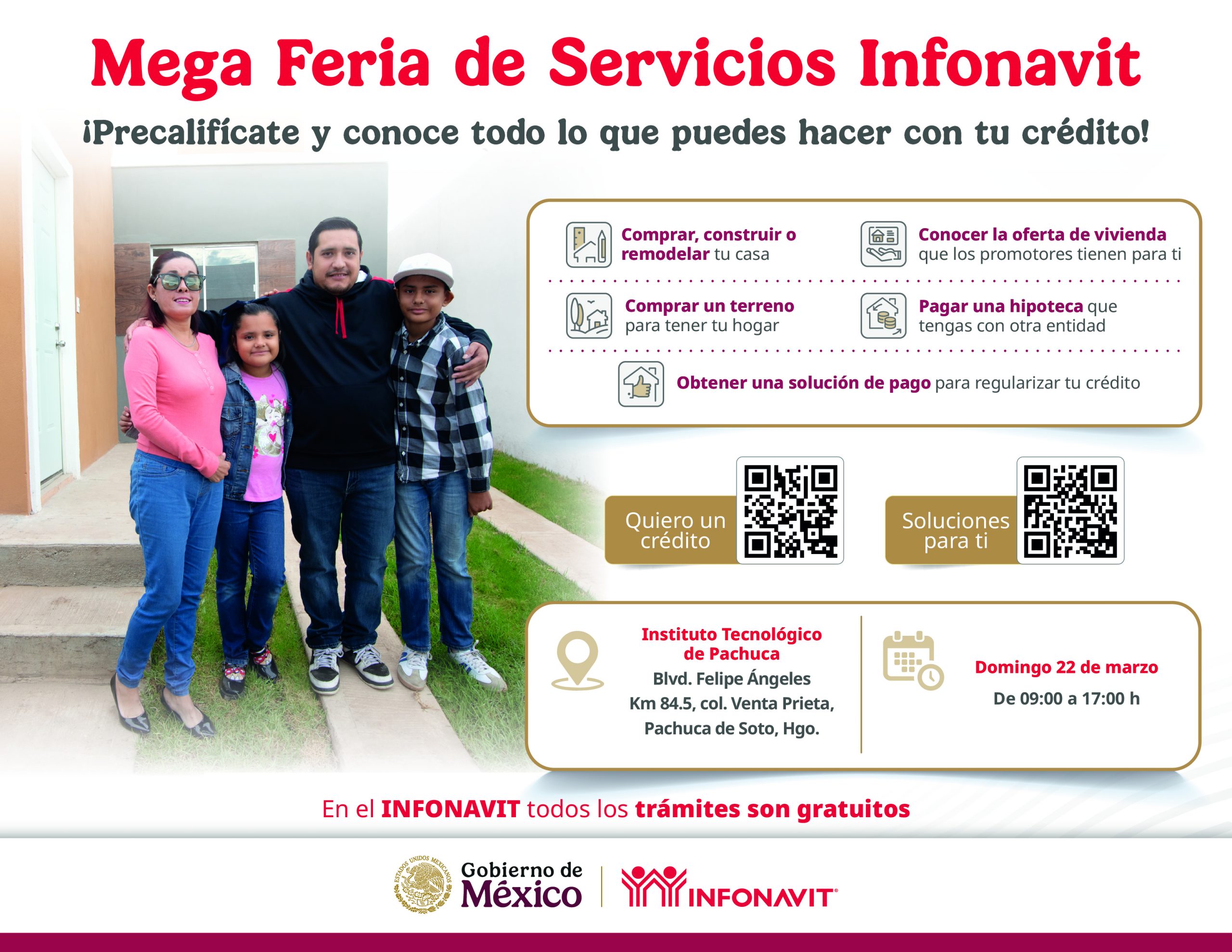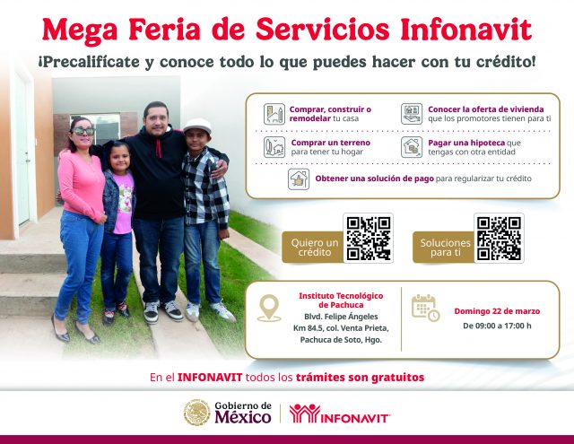 Con el objetivo de acercar todos sus servicios a las y los trabajadores del estado, el Instituto del Fondo Nacional de la Vivienda para los Trabajadores (Infonavit) realizará una Mega Feria de Servicios, este domingo 22 de marzo, en las instalaciones del Instituto Tecnológico de Pachuca, en un horario de 9:00 a 17:00 horas.