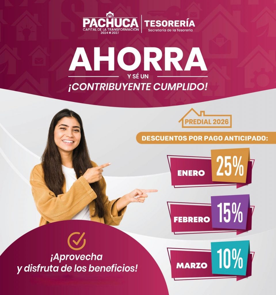El 02 de enero de 2026 abre en Pachuca el periodo en el que las personas contribuyentes podrán acceder a descuentos escalonados en el pago del Impuesto Predial correspondiente al ejercicio fiscal 2026.