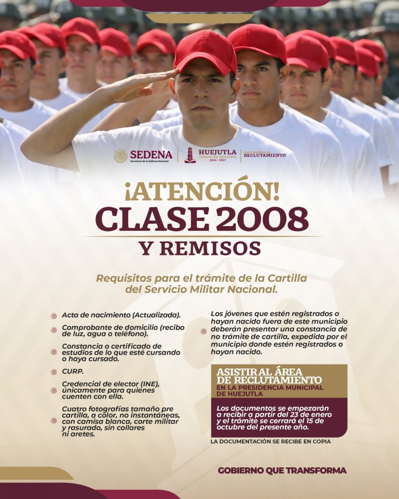 Con el objetivo de fortalecer la responsabilidad cívica y brindar certeza a las y los jóvenes en edad de cumplir con el Servicio Militar Nacional, el Gobierno Municipal de Huejutla, encabezado por José Alfredo San Román Duval, dio a conocer el inicio del trámite de la Cartilla Militar para jóvenes de la Clase 2008 y remisos.