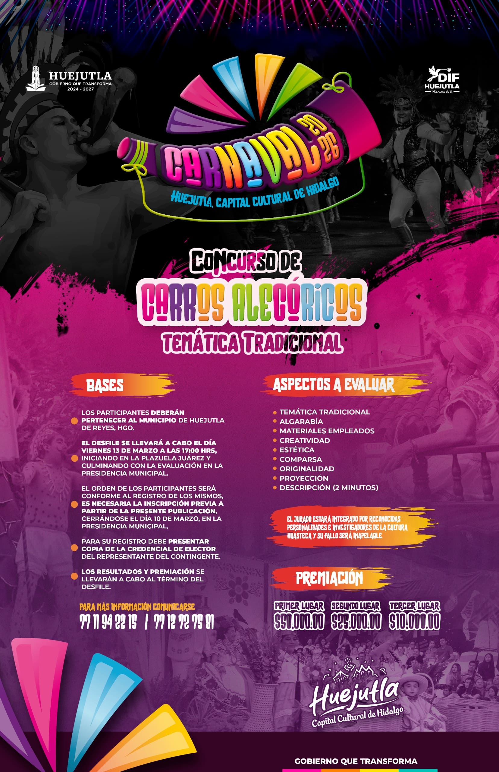 Con el propósito de fortalecer la identidad cultural y promover la participación ciudadana, el presidente Municipal invita a la población a formar parte del Concurso de Carros Alegóricos con temática tradicional, en el marco del Carnaval Huejutla 2026, reafirmando el orgullo que distingue a Huejutla como Capital Cultural de Hidalgo.