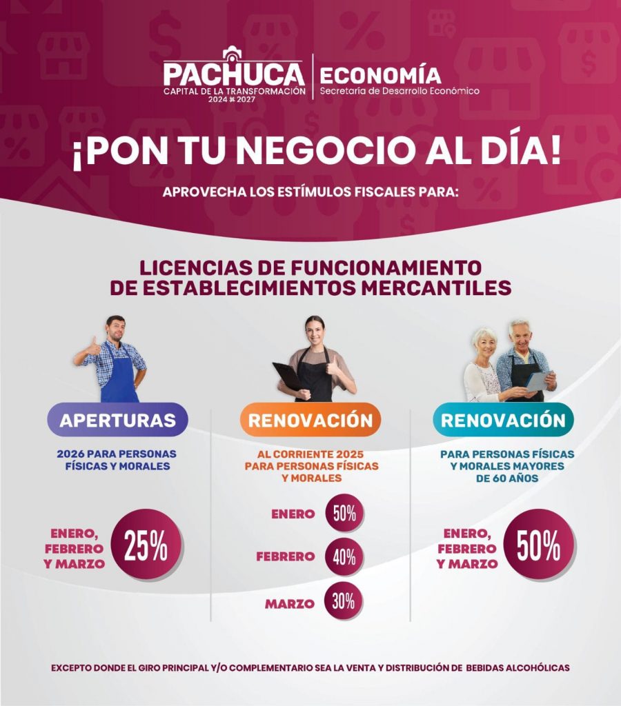 Como parte de las medidas orientadas a facilitar la regularización y fortalecer la actividad económica local, el Ayuntamiento de Pachuca a través de la Secretaría de Desarrollo Económico aplicará estímulos fiscales para la obtención y renovación de licencias de funcionamiento de establecimientos mercantiles.