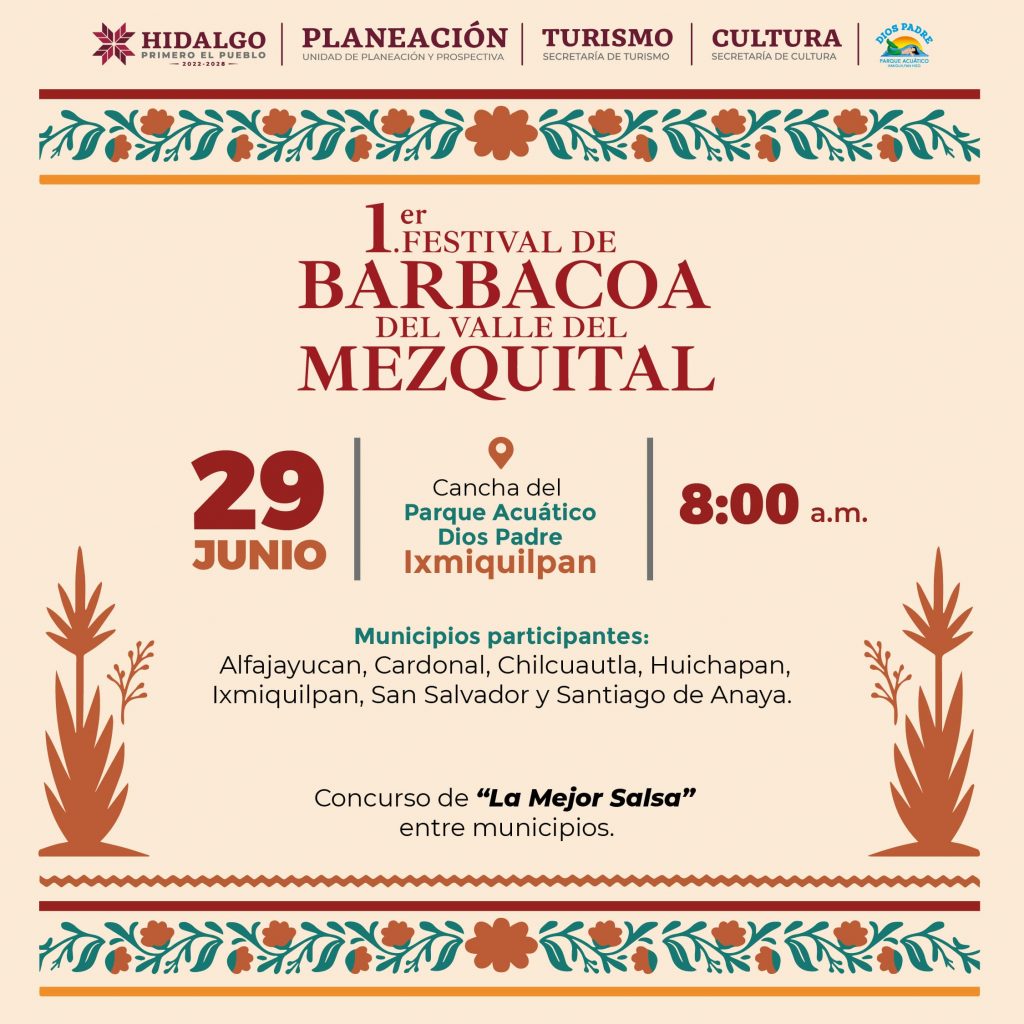 El próximo domingo 29 de junio, a partir de las 8:00 horas, se llevará a cabo el Primer Festival de la Barbacoa del Valle del Mezquital, un evento gratuito y abierto al público en las canchas del parque acuático Dios Padre, ubicado en el municipio de Ixmiquilpan.