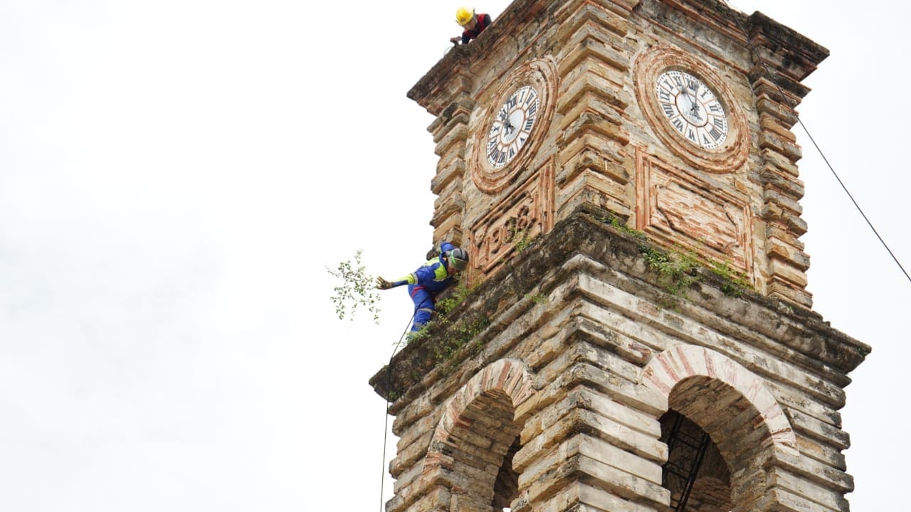 Durante la mañana de este jueves 7 de agosto, se efectuó el retiro de maleza que se encontraba en las paredes laterales de esta histórica estructura.